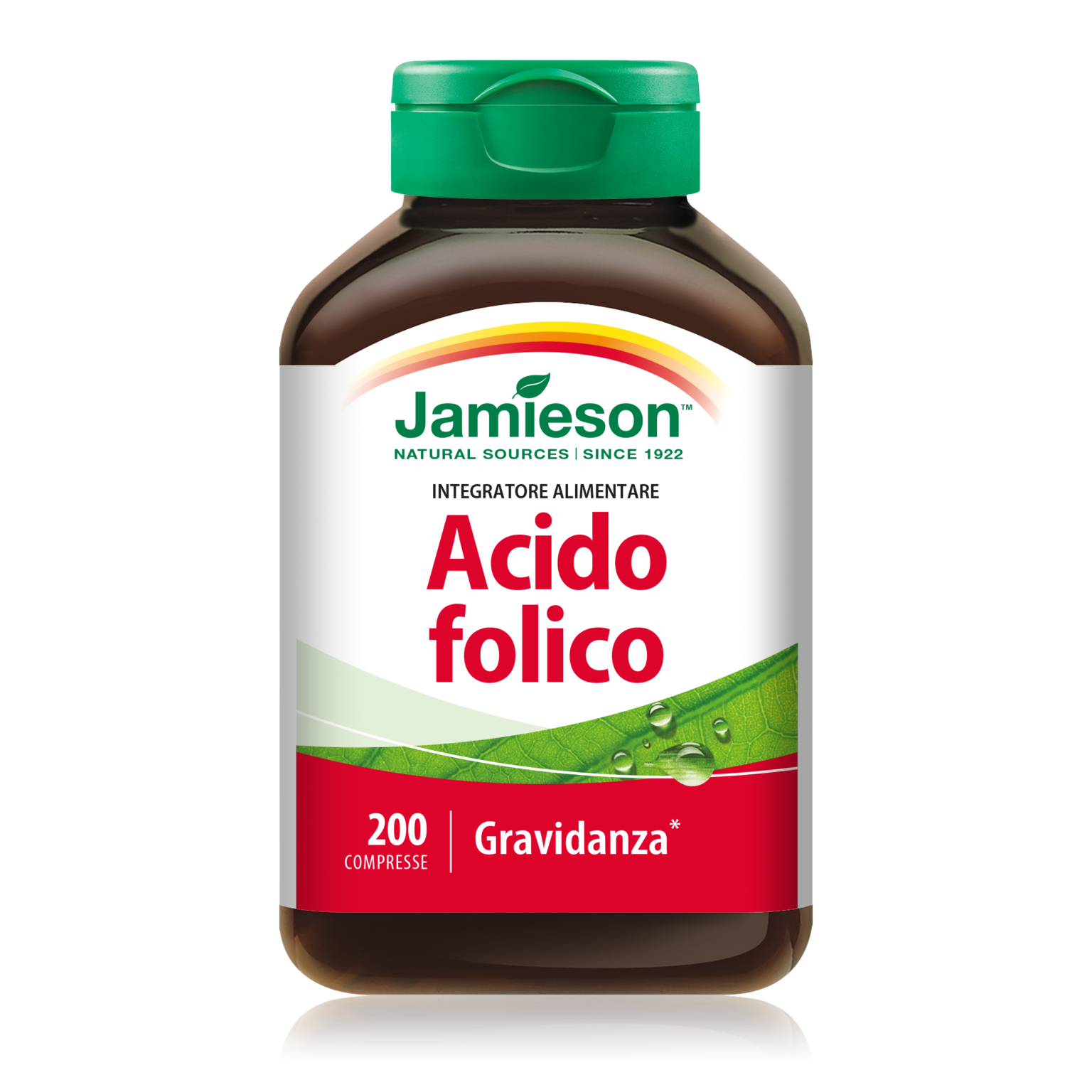 L’acido folico, noto anche come vitamina B9, è una vitamina essenziale per il corpo umano in quanto partecipa a diversi processi molto importanti per l’organismo. Interviene nella sintesi del DNA e delle proteine e nella formazione dell’emoglobina. Inoltre svolge una funzione importante nei tessuti embrionali, sottoposti a proliferazione e differenziazione cellulare, aiuta a prevenire difetti del tubo neurale e contribuisce al normale processo di crescita dei tessuti materni in gravidanza. Per questo motivo, prima e durante la gravidanza, è richiesto un maggiore apporto di questa vitamina. Inoltre contribuisce alla normale funzione del sistema immunitario. L’acido folico viene eliminato con le urine, perciò deve essere regolarmente introdotto con la dieta. Fonti alimentari ricche di acido folico sono le verdure a foglia verde, come spinaci, cardi e lattuga, i legumi, gli agrumi e la frutta secca come noci e mandorle. Una carenza di acido folico può portare a insonnia, depressione, debolezza e affaticamento. Le compresse di Acido Folico di Jamieson vengono realizzate attraverso un procedimento denominato “Dry Compression” secondo il quale gli ingredienti vengono miscelati a secco evitando l’impiego di alcool, altri solventi chimici, temperature elevate e prolungate. Questo sistema evita che l’acido folico venga alterato e garantisce l’integrità, la piena efficacia e l’assoluta purezza del prodotto.