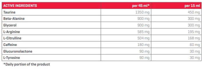 Drink 45–90 ml 30 min. before planned workout. Do not consume more than 90 ml per day. Do not combine with other products containing caffeine! Shake before use. Please note: the product has a strong stimulating effect. Do not take before bedtime! The product can be dissolved in water.