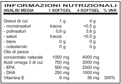 Hanno un elevatissima concentrazione di Omega 3: una perla contiene 1000 mg di olio di pesce dove ben 750 mg sono acidi grassi EPA/DHA con un rapporto 2:1 (500 mg di EPA e 250 mg di DHA).